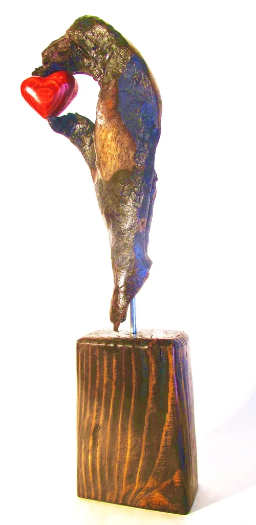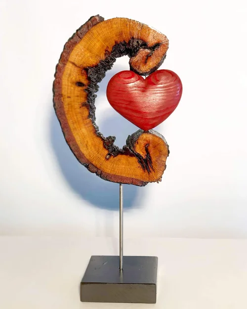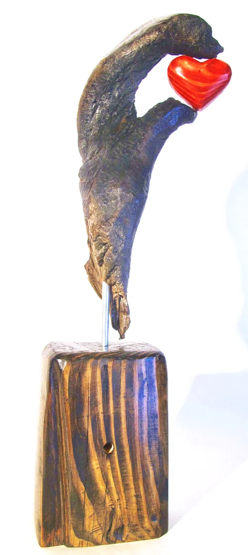 Evidence shows that the Antarctic ice sheets are becoming increasingly unstable, and that the Greenland ice sheets could collapse entirely if global temperatures rise by 1.5C - which could happen as soon as 2030 if current trends persist. With this in mind I produced this piece from wood that I salvaged from the Californian wildfires - another direct affect of climate change. The piece has been sculpted to balance precariously, a narrative that is a literal representation of life as we know it. The heart on top also balances as if it can fall at any moment. The heart that represents our love for life also represents the knowledge we hold for what we need to do to reverse these changes. The materials used are all salvaged from the locality of Californian burn areas and near my studio in North Wales.