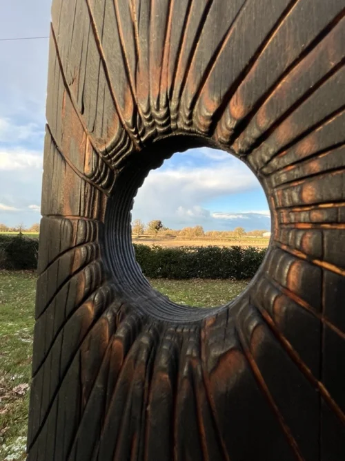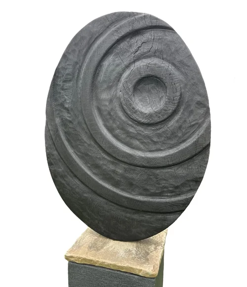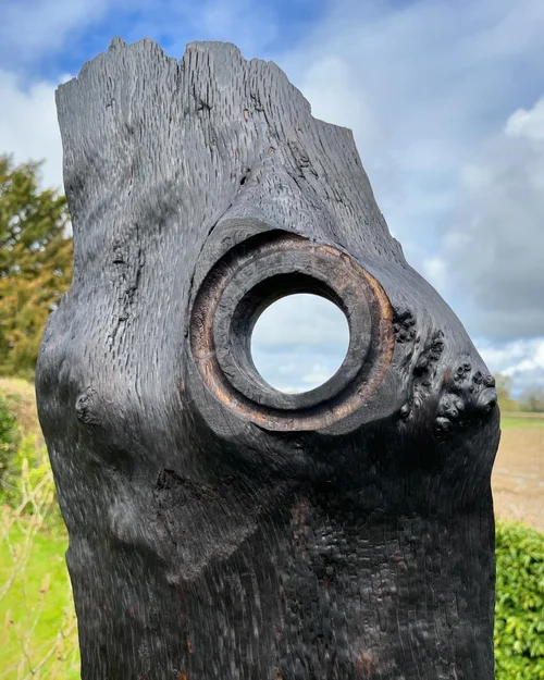 Enigma, 2024, Unwanted and discarded oak, 196cm tall, Yakisugi Technique. This piece is influenced by the many standing stones we find throughout the Uk, especially those that have carvings of ‘cup and ring marks’ . There are many suggestions of what these marks might mean. To me the carvings or message from the past is a wonderful enigma.Happy to share this new piece on the festival of Beltane, I might end up dancing around this sculpture later!
